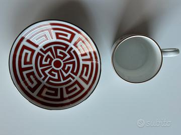 Tazzina da catté con piattino della celebre collezione Labirinto Scarlatto di Richard Ginori. Il motivo geometrico è stato ideato dal maestro Gió Ponti nel 1926. Realizzata in pregiata porcellana, presenta un decoro a labirinto in rosso scarlatto rifinito con una preziosa filettatura in platino. #ginoriporcellane #ginori #gioponti #tazzinadacaffe #tazzinacollezione #ginori1735 #richardginori
