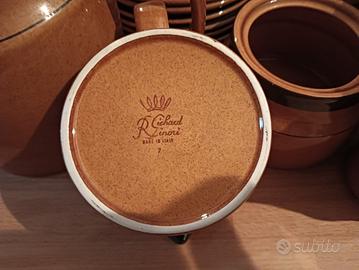 Come da titolo vendo un servizio completo in ceramica di Richard Ginori. Fa parte della serie “Paiolo” disegnata da Antonia Campi. La serie è stata prodotta in Italia e presenta un design rustico smaltato marrone. Comprende: - Teiera - Lattiera - Zuccheriera - 12 tazze - 12 piatti abbinati Condizioni pari al nuovo, mai stati usati. Valore intorno ai 450€