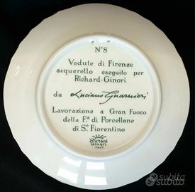 Piatto in fine porcellana Richard Ginori della serie vedute di Firenze eseguito ad acquarello dal pittore fiorentino Luciano Guarnieri. Lavorazione a gran fuoco della Fabbrica di porcellane di Sesto Fiorentino. Il bordo è quello tipico del "vecchio Ginori. La decorazione è eseguita in un intenso blu con parte in rilievo subito sopra l'anno. Annata del 1978 dal titolo veduta della città dal Lungarno. Dimensioni: diametro bordo cm. 20,4, base cm. 12,6; alto cm. 2,4. Senza sbeccature e felature.