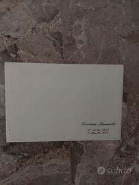 Si tratta di un ricordino color avorio stampato in occasione del funerale del grande tenore avvenuta a settembre 2007, formato chiuso 17 x 11, aperto 17 x 22, con foto inserita nella parte destra e frase nella parte sinistra, busta in cartoncino avorio, terza ristampa