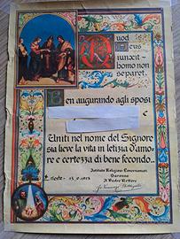 Oltre al libriccino, cartonato e in condizioni perfette, viene allegata anche la pergamena del matrimonio, firmata dal Padre Rettore dell'Istituto Religiosi Concezionisti di Saronno.