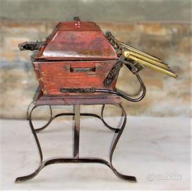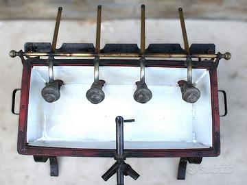 Riempitrice manuale per bottiglie risalente agli anni '20 del secolo scorso. Si tratta di una apparecchiatura utilizzata, fin dalla fine dell'Ottocento nelle cantine.La struttura portante è in ferro e legno,la vaschetta in rame smaltato perfettamente conservata,senza graffi.Un galleggiante in rame posto nella vasca permette di alimentare la riempitrice regolando il prelievo, tramite un tubo, del vino dalla botte.I 4 becchelli, dotati di contrappeso,sono in ottone.Completa del coperchio originale.DIMENSIONI:LU57CM; LA 53CM(becchelli inclusi): H 46CM(con coperchio)NO SPEDIZIONI