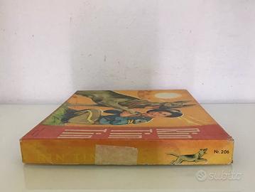 Rin Tin Tin, gioco in scatola nuovo, fondo di magazzino, mai giocato, ottime condizioni, completo di tutto. Segnalo, come evidenziato nelle foto, due piccoli pezzi di nastro adesivo su due bordi della scatola. Tracce del tempo e dell'usura sul coperchio, in prossimità dei bordi. Tabellone splendidamente illustrato e bellissime pedine che raffigurano Rin Tin Tin e Rusty.