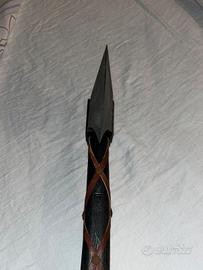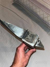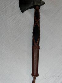 Ritrovata in cantina, almeno 45 anni di storia, vendo una riproduzione di un’ascia. Completamente fatta in legno decorato (anche la parte che dovrebbe essere di ferro è legno decorato), manico rivestito e decorato in cuoio. Probabilmente acquistata a Gubbio da mio nonno più di 45 anni fa. Ottima come elemento d’arredo a parete!