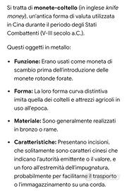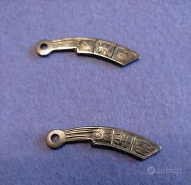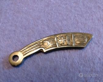 ANTICHE MONETE CINESI IN OTTONE. ERANO USATE COME VALUTA E MONETA DI SCAMBIO, PRIMA DELL' INTRODUZIONE DELLE MONETE ROTONDE FORATE, DURANTE IL PERIODO DEGLI STATI COMBATTENTI ( V - III SEC. A.C. ). LA FORMA RIPRENDE L' IDEA DEL COLTELLO, PERCHÉ IN QUEI TEMPI LE MONETE SI RIFACEVANO AGLI ATTREZZI AGRICOLI. IL FORO RAPPRESENTA IL MEZZO PER FACILITARNE IL TRASPORTO MEDIANTE UN CORDINO. LE MONETE PRESENTANO DELLE INCISIONI CHE RAPPRESENTANO CON CARATTERI CINESI IL VALORE E LE AUTORITÀ EMITTENTI. PEZZO RARO , DA COLLEZIONE