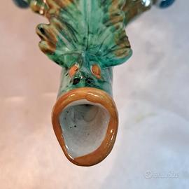 Riproduzione di un antico versatoio del XVIII secolo, in maiolica con manico a rilievo e beccuccio a forma di pesce, decorato a nodo e con un medaglione tra i due festoni. Ceramiche Boria anni 60 Caltagirone, E' in ottime condizioni, 28 x 20 x h 30 cm peso 2 kg.