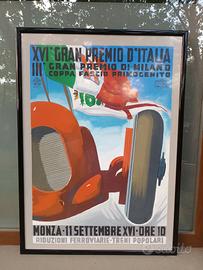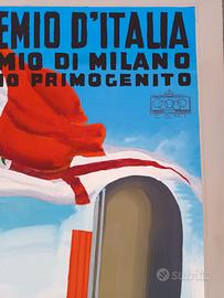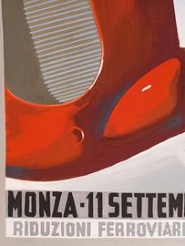 Riproduzione, copia dipinta a mano (tempera su cartoncino) di manifesto pubblicitario del 1938 riguardante il gran premio d'Italia di automobilismo di Monza.
