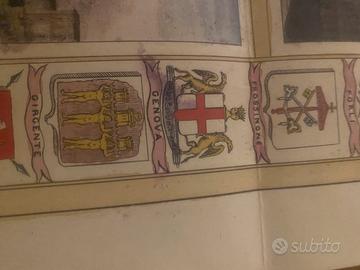 Riproduzione della Rarissima e stupenda mappa celebrativa dell’Unità d’Italia stampata a Milano presso la litografia Ronchi per conto della Società Editrice dell’Emilia. Eseguita in occasione della proclamazione a Re d’Italia di Vittorio Emanuele II avvenuta a Torino il 17 marzo 1861. La grande carta pittoresca si allontana dal modello classico geografico ma mostra la penisola presa dalle Alpi e orientato prospetticamente con il meridione in alto. La veduta fu disegnata da Gaetano Cappuccio probabilmente su diretta commissione di Cavour in occasione della proclamazione dell’Unità d’Italia. E’ circondata da 46 ritratti di personaggi italiani illustri, 15 vedute di monumenti notabili, 78 stemmi di città e dalle immagini dei principali costumi italiani dai tempi degli etruschi sino a quelli moderni.