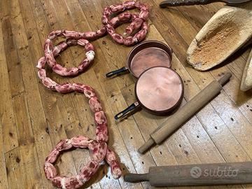 Vendo riproduzioni teatrali di attrezzi e accessori cucina. In parte autocostruiti. Utilizzati per rappresentazioni teatrali di bambini e/o adulti. Dimensioni e quantità: 3 “Pasta penne” (polistirolo) cm 100 -– 1 Mannaia da macellaio (legno) cm 55 --- 2 Posate (legno) cm 70 --- 2 Mattarelli (legno) cm 70 --- 2 Padelle (lamiera verniciata rame) --- 1 Salsiccia (gommapiuma, stoffa) mt 6