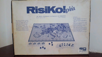 Risiko! più, gioco in scatola anni '80, editrice Giochi. Usato ma in buono stato. Manca 1 dado rosso, 1 stendardo. Completo di scatola, tabellone, istruzioni, carri armati grandi 5 per colore, bandierine 5 per colore, carri armati piccoli: 68 blu, 66 verdi, 65 viola, 65 gialli, 65 rossi, 64 neri.