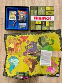 Risiko! Versione “allegato”, Editrice Giochi. Vintage edizione da viaggio . Mai utilizzato, scatola con leggeri segni di usura. Al suo interno: 1 plancia, 4 eserciti di differente colore, 1 mazzo di carte Territori, 1 mazzo di carte Obiettivi, 3 dadi rossi e 3 dadi blu. 20x20 cm.