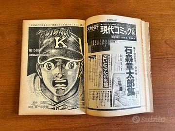 Originale, molto raro anche in Giappone! Contiene opera originale di Monkey Punch (creatore Lupin III) e opere originali di Shotaro Ishinomori, Baron Yoshimoto, Shiro Kasama, Goseki Kojima... ecc Condizioni come in foto, controllare bene Numero storico di Weekly Manga Action con copertina illustrata da Monkey Punch, il creatore di Lupin III. All’interno contiene un’opera originale di Monkey Punch, creatore di Lupin III (con pagine a colori), insieme a opere e contributi originali di Shotaro Ishinomori, Isao Kojima, Shiro Kasama, Kenji Nanba, Takeshi Kojima, Masamichi Yokoyama e Kazuo Uemura. Originale e ormai introvabile anche in Giappone. Perfetto per collezionisti di manga vintage e materiale d’epoca anni ’60, ’70 e ’80. Ideale per chi ricerca autori storici come Monkey Punch, Shotaro Ishinomori, Go Nagai, Leiji Matsumoto, Kazuo Koike, Goseki Kojima, Sanpei Shirato, Osamu Tezuka, Mitsuteru Yokoyama, Fujiko Fujio, George Akiyama, Keiji Nakazawa, Shinji Mizushima, Hiroshi Motomiya, Ryoichi Ikegami, Jiro Taniguchi, Tetsuya Chiba, Kazuo Umezu, Yoshiharu Tsuge e Masami Kurumada. Interessante anche per appassionati di serie ed opere vintage Devilman, Mazinger Z, Babel II, Ashita no Joe (Rocky Joe), Lone Wolf and Cub, Golgo 13, Cyborg 009, Black Jack, Tetsuwan Atom (Astro Boy), Garo Magazine, Lady Oscar, Galaxy Express 999, Ushio to Tora, Tiger Man, Violence Jack, Kamui-den, Cobra, Hokuto no Ken, Captain Harlock e molte altre opere storiche del fumetto giapponese. Condizioni come in foto, con inserto. Originale giapponese d’epoca. Nelle mie altre inserzioni sono disponibili ulteriori articoli rari legati a Lupin III, Monkey Punch, riviste giapponesi vintage e manga originali anni ’60–’80. Per qualsiasi informazione o foto aggiuntiva contattatemi senza problemi. Disponibili anche molti altri articoli di Lupin III e Monkey Punch originali giapponesi nelle mie altre inserzioni Per qualsiasi informazione o ulteriore foto non esitate a contattarmi!!