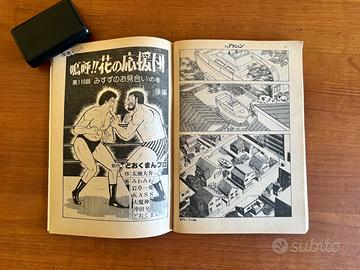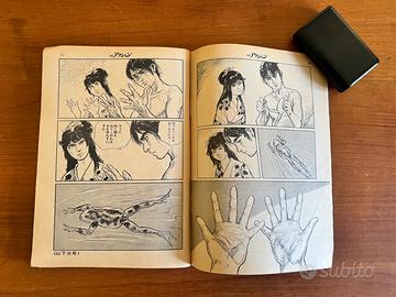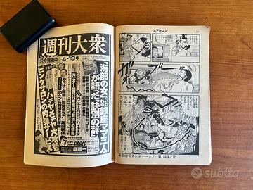 RIVISTA GIAPPONESE WEEKLY MANGA ACTION KAZUO KAMIMURA GOSEKI KOJIMA KOIKE 1979 In vendita un numero storico della celebre rivista antologica giapponese Weekly Manga Action (週刊漫画アクション), risalente all'aprile del 1979. Si tratta di un pezzo da collezione fondamentale per gli amanti del genere Seinen e Gekiga, contenente capitoli di alcuni degli autori più influenti della storia del manga. Contenuti principali e Artisti presenti: All'interno di questo numero troverete opere di maestri assoluti: Jarinko Chie (じゃりン子チエ) di Etsumi Haruki: Presente con una bellissima splash page d'apertura. Un classico della commedia umana ambientato a Osaka, diventato poi un celebre anime di Isao Takahata (Studio Ghibli). Aoniyoshi (あをによし) di Kazuo Koike & Goseki Kojima: La leggendaria coppia creativa di Lone Wolf and Cub e Lady Snowblood. In questo numero è presente la prima parte (前編) di un capitolo con lo stile pittorico inconfondibile di Kojima. Ah!! Hana no Ouendan (嗚呼!!花の応援団) del gruppo Dokuman Pro: Il celebre manga satirico e grottesco sui club di tifoseria universitaria, un vero fenomeno culturale degli anni '70 e '80. Rind 3 (リンド3) di Satoshi Gago: Un'opera dinamica a tema motoristico (Hard-boiled/Racing), molto rappresentativa dell'estetica dell'epoca. Sezione Ero-Gekiga: La rivista include anche storie brevi dal taglio adulto e provocatorio, tipiche del target della rivista in quegli anni. Dettagli Tecnici: Editore: Futabasha (双葉社). Lingua: Giapponese. Epoca: Showa 54 (Aprile 1979). Contenuti extra: Include inserti pubblicitari dell'epoca, tra cui una pagina dedicata alla rivista Shukan Taishu con riferimenti a celebrità come Shinichi Mori. Condizioni: L'oggetto è originale dell'epoca. Le pagine presentano il classico ingiallimento naturale della carta "pulp" giapponese che ne attesta l'autenticità. Per la rilegatura fare riferimento alle foto per i dettagli. Per qualsiasi informazione o ulteriore foto non esitate a contattarmi!!