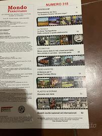 Rivista treni e trenini mondo ferroviario 318 usato in ottime condizione articoli su : Presentazione del libro "La Suzzara - Ferarra 125 anni dopo" 11 LA TECNICA Le Zone Tachigrafiche Dalle cartacee a quelle elettroniche 12 LOCOMOTIVE Breve storia delle D 145 a trent'anni dalla loro entrata in servizio - seconda parte 20 FIERE & MOSTRE A Genova per il Model Fantasy Show 34 PLASTICI & DIORAMI Diorama con neve