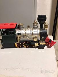 Nota: le rotaie non sono complete ma mancano pezzi (vedi foto); la locomotiva funzionerebbe con 6 pile AA ma provandola non si muove (serve intervento per ripulire i contatti e per calibrare il movimento ruote). Non mi azzardo a toccare niente perché sono una pasticciona e farei solo dei danni.