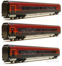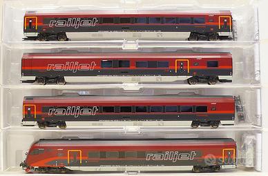 Convoglio in 7 elementi + locomotiva, nella livrea Railjet OBB "Spirit of Zurich". Tutti i modelli sono nuovi, mai usati, completi ciascuno della propria confezione originale e aggiuntivi ancora sigillati.