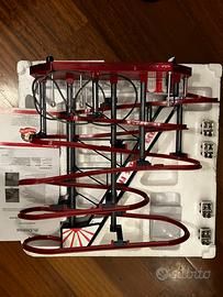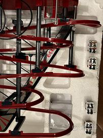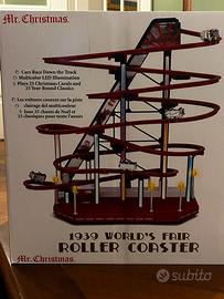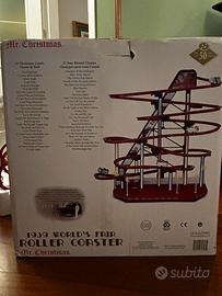 Riproduzione di montagne russe elettrica della linea Mr. Christmas ispirata al New York City 1939 Worl’s Fair. Decori effetto cromato. Base rossa lucida con luci neon con variazione di colore automatica. 25 Christmas songs e 25 year-round classics. Alimentazione con adattatore incluso.