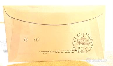 Roma-New York via terra Celebrazione Overland 1 - Busta FDC Numerata 1996 - Venetia Club (Modena) Come nuova Busta Primo Giorno di emissione (First Day Cover) numerata. Edizione: Realizzata da F.D.C. Capitolium (Roma) per il «Venetia Club» (Modena). Numero di serie: Nº 186 (visibile sul retro) Annulli (Timbri): Fronte: Annullo speciale tondo "Roma Filatelico - Giorno di emissione" con logo della spedizione. Retro: Annullo speciale "Roma Filatelico" raffigurante Castel Sant'Angelo Grafica: Illustrazione stilizzata "Cachet" sul lato sinistro con la Statua della Liberta, i mezzi Iveco e il logo "Venetia" Dati Tecnici del Francobollo Titolo dell'emissione: Traversata transcontinentale dall'italia agli Stati Uniti via terra (Overland 1). Data di emissione: 13 aprile 1996. Valore facciale: 4.650 Lire. Soggetto: Veicolo della spedizione (camion Iveco 330.30 ANW arancione) e cartina con il percorso Roma-New York. Disegnatore: G. Tenti. Stampa: Rotocalco, policromo. Officina Carte Valori: I.P.Z.S. Roma (Istituto Poligrafico e Zecca dello Stato). Dentellatura: 13¼ x 14 a pettine. Dimensioni: 30 × 40 mm.