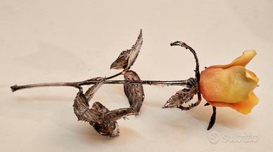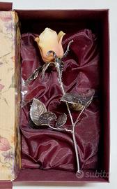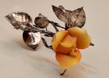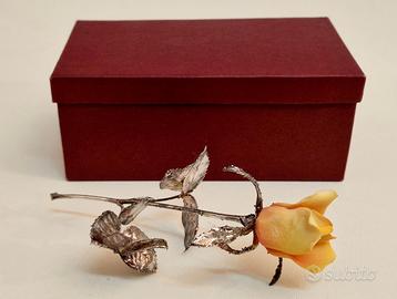 Una splendida rosa in porcellana e argento sterling realizzata da Scapecchi in Toscana. Lo stelo e le foglie sono in argento sterling con una sorta di rivestimento tonale dorato, i petali della rosa sono in porcellana Bisquit originale di Capodimonte, misura 16 cm. L’articolo è inserito all'interno della scatola originale