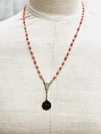 Antico rosario con semini in bachelite colore rosa antico con medaglia della Beata Vergine Consolata e Beata Vergine di Caravaggio. Cm 33