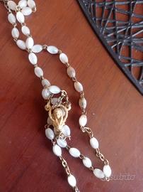 Vendo rosario antico con grani in madreperla e dettagli in metallo dorato. Il crocifisso presenta la figura di Gesù in rilievo, mentre la medaglietta centrale raffigura la Madonna.