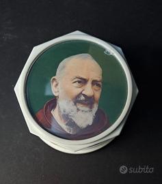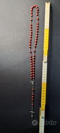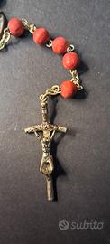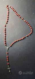 Rosario con grani colore rosa, crocifisso argentato e raffigurazione di Padre Pio.
