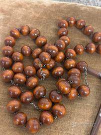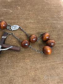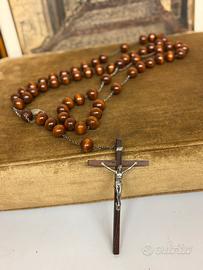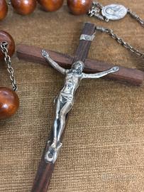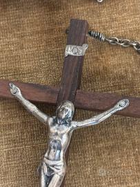 Il crocifisso è di legno, con il corpo di Cristo (corpus) e la targhetta con la scritta "INRI" in metallo color argento.