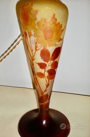 Lampada a fungo firmata Gallé , in pasta di vetro trattata alle polveri ossidanti, decorata a cammeo e rifinita alla piccola ruota, di gusto art nouveau.