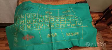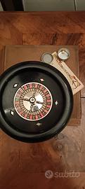 Vendo splendido set Roulette da tavolo di produzione francese, risalente alla metà del XX secolo (epoca Art Déco/Modernista). Un pezzo di storia del gioco d'azzardo da salotto, ideale per collezionisti o come raffinato oggetto d'arredo. Il set comprende: Roulette: Tamburo rotante in bachelite nera (o legno laccato) con intarsi a diamante. Meccanica fluida e parti metalliche in ottime condizioni. Diametro generoso. Fiches d'epoca: Rarissima dotazione completa di fiches in Galalite/Bachelite di diversi colori e dimensioni (diametro grande e piccolo), conservate nella loro scatola a scomparti originale. Il materiale offre il tipico suono "cristallino" dell'epoca. Tappeto (Layout): Panno in feltro verde originale con scritte in francese (Manque, Impair, Passe, Pair). Colori vividi e tessuto integro. Documentazione: Foglio istruzioni originale illustrato in lingua francese. Accessori: Pallina originale inclusa. Condizioni: L'intero set è in condizioni buone per la sua età. La roulette è funzionale; il panno presenta normali pieghe da conservazione ma è privo di strappi; le fiches sono integre e lucide. La scatola esterna in cartone mostra segni di usura e del tempo che ne testimoniano l'autenticità. Nota: il rastrello (râteau) non è presente. Produzione: J.R.L. Paris (marchio storico francese). Epoca: 1940-1950 circa. Ritiro a Mano a Milano in zona Corso Sempione, Piazza Firenze Oppure spedizione .