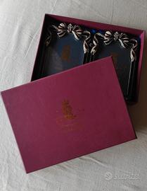 Portafoto formato da due cornici smaltate color bordeaux con bordo in metallo e grande fiocco tempestato da strass.