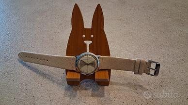 Affascinante esempio di orologeria d'oltrecortina degli anni '60/'70. Un pezzo di storia della Repubblica Democratica Tedesca (DDR), caratterizzato da un design esteticamente molto ricercato, verrà fornito con cinturino begie in pelle scamosciata.
