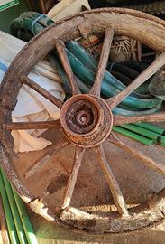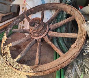Vendo ruota in legno antica, probabilmente appartenente a un vecchio carro agricolo. Condizioni come da foto: struttura completa ma con parti deteriorate dal tempo. Ideale per restauratori, collezionisti, scenografie, arredo rustico o agriturismi.