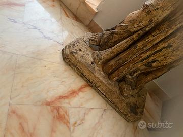 Antica statua lignea del1500circa di S Francesco alta piu o meno 1,50 cm e poggiata fissa su un piccolo basamento di legno. Alla statua era stato incollato il saio ed oggi ci sono piccoli pezzetti che si sono alzati. Il frate teneva in braccio la porziuncola ( mancante) dove venivano messe le elemosine, Una mano e’ ‘ mancante. Il viso ha gli occhi di vetro e una espressione molto dolce.