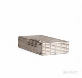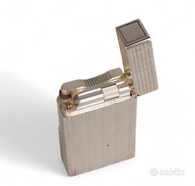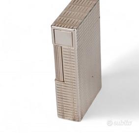 Accendino da tasca S.T. Dupont, modello Ligne 1 (codice 0013125), realizzato in metallo placcato argento con motivo decorativo a righe e finitura lucida. Si tratta della variante “Anneau”, che si distingue per l’anello alla base, presente nei modelli originali ricaricabili.