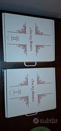 DUE VOLUMI: LA SACRA BIBBIA. ANTICO E NUOVO TESTAMENTO, ed. Armando Curcio Editore Collana Aurea. 2 tomi in formato Atlantico. Legatura in piena pelle con 4 costole al dorso. Incisioni a caldo e impressioni in oro ai paitti e al dorso. Due cordini segnapagine in seta. Risguardi con stampa in oro. 736 pagine per tomo. 230 foto nei due tomi. Stampato su carta Freelife Ivory da 170 g appositamente realizzata dalle cartiere Fedrigoni. Tiratura di 1999 esemplari. Il mio è il 1554. Le copie sono numerate a mano e su ogni volume è presente il punzone a secco con l’imprimatur del Vaticano. Le caratteristiche grafiche si ispirano alla Sacra Bibbia di Gutemberg. Lo studio sui fregi e sulle iconografie sono riferibili al settecento, periodo in cui Monsignor Antonio Martini traduceva il testo della Bibbia e sul cui lavoro di traduzione si basa la presente opera. I 2 tomi sono protetti da carta pergamenacea muta e contenuti in valigette editoriali di cartone antiurto con titoli e fregi a stampa. Peso circa 19 Kg