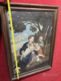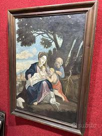 Dipinto olio su tela, tutto originale, Scuola Italiana Pittura Fiorentina, rappresenta la sacra famiglia, San Giuseppe, Santa Maria, Gesù e San Giovannino con L'agnello su un fondale italiano collina Fiorentina ad olio su tela, solo la tela 93x66cm, non ci sono firme, cornice autentica coeva dell'epoca, in legno di noce, molto grande 103x75cm, spedizione professionale con cartone ondulato polistirolo, ben imballato