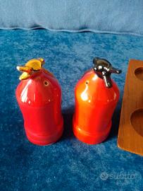 Sale e pepe a forma di estintore con piedistallo in legno massello