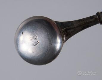 I cucchiaini recano punzone “800” privo di stella, tipico della produzione italiana anteriore al 1934, con piccolo marchio figurato di controllo/fabbrica. Questo conferma l’uso di argento 800 e una datazione tra la fine del XIX e i primissimi anni del XX secolo. L’insieme è coerente per epoca, materiali e stile.