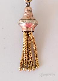 Saliscendi per catena borbonico rosa e giallo XIX secolo. Pendente vintage realizzato con motivi floreali, nappe laterali e una pietra rossa centrale.