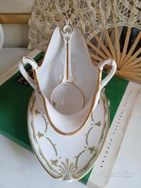 In porcellana bianca con decori delicatissimi di ghirlande di fogliame e foglia d'oro. Nel cucchiaio così come nella salsiera è presente il giglio, simbolo fiorentino.