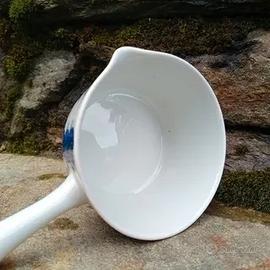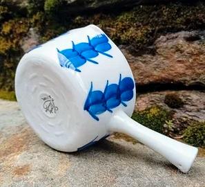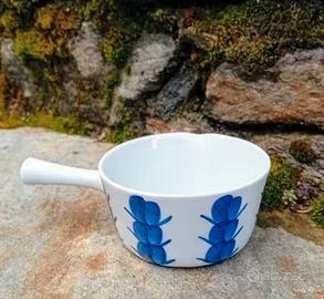Lingby Porcellaen, Danimarca. Manifattura nota per oggetti e stoviglie di alta qualità e design . In attività dal 1936 al 1969. Piccola salsiera /saucepan con manico, versatoio e fondo termico. Decorata a mano motivo "Blabaer" mirtillo (blueberry) anni '60. Pezzo abbastanza raro. Condizioni ottime. Diametro cm 10 lunghezza con manico cm 16 altezza cm 5