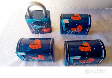 Vendo a collezionisti, anche separatamente, salvadanai in latta smaltata, alcuni anche vintage, usati, con qualche segno di usura, buone condizioni generali. Prezzi trattabili per acquisti multipli od in blocco.
