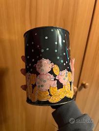 Coppia di salvadanai cilindrici in latta con illustrazioni divertenti: uno con maialini e monete, l'altro con cani dalmati. Stile vintage anni '90. Sono ancora chiusi e pronti all'uso. leggera ammaccatura come da foto, che non ne pregiudica l'utilizzo.