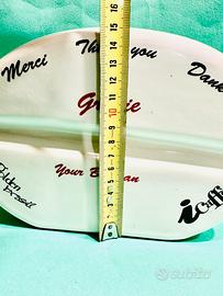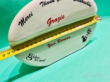 UNICO “ STUPENDO “ ALTA QUALITÀ “ IN TERRACOTTA SMALTATA “ oggetto di grande impatto, ESCLUSIVO !!!! Salvadanaio in ceramica a forma di chicco di caffè, decorato con messaggi di ringraziamento in diverse lingue e il logo "Golden Brasil" insieme alla scritta "Your Barman". Traduzione: Merci: Grazie Thank you: Grazie Danke schön: Grazie Grazie: Grazie Your Barman: Il tuo barista Golden Brasil: Brasile d'oro Caffè: Caffè. Oggetto d’arredo ‘ NON SOLO DA BAR ‘ ma anche come chicco designer da esporre in diversi ambienti e locali ! Oggetto da collezione. Vedi foto per misure e dettagli, si cede come da foto e descrizione. IMPECCABILE TENUTO MANIACALE CONSERVAZIONE “ AAAA+++ “ !! Chi se lo accaparra ha di sicuro un oggetto di grande collezionismo, si risale agli anni 70/80 oggetto Vintage!!