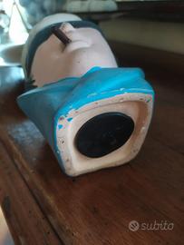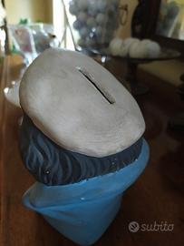 Salvadanaio vintage anni 80 in terracotta raffigurante Elvis Presley. Il sigaro è molto delicato ed è già stato incollato. Altezza 13.7 cm.