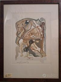 Articolo raro - firmato - timbrato - cornice e vetro Misure : circa cm. 35,5 x 46,5 Dalí impiegò nove anni, producendo 33 disegni per ciascuna sezione,più il ritratto del Sommo Poeta. La commessa fu però ritirata, perché c’era chi non gradiva che fosse un artista catalano a omaggiare il padre della lingua italiana. Le tavole, numerate e firmate a matita da Dalì, dopo la marcia indietro italiana, nel 1960, furono esposte al Musée Galliera di Parigi e, dopo quattro anni di assiduo lavoro con lo stampatore Raymond Jacquet, trasposte in altrettante xilografie. La cartella completa è presente in cento copie al mondo, tutte originali e firmate, ma non uguali, essendo state colorate a mano dall’artista. Le tavole che la compongono misurano 30 per 40 centimetri e quella esposta a Martinengo è una delle cartelle.  Ogni xilografia rappresenta un personaggio o un evento: spesso sono dissacranti, ironiche e grottesche se riferite a scene di Inferno e Purgatorio, delicatissime e celestiali quelle di Dante e Beatrice nel Paradiso.