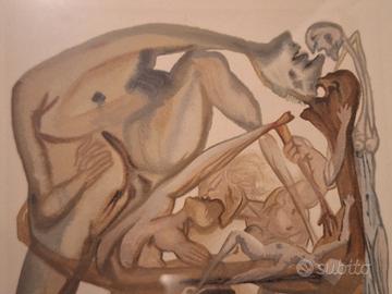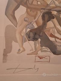 Articolo raro - firmato - timbrato - cornice e vetro Misure : circa cm. 35,5 x 46,5 Dalí impiegò nove anni, producendo 33 disegni per ciascuna sezione,più il ritratto del Sommo Poeta. La commessa fu però ritirata, perché c’era chi non gradiva che fosse un artista catalano a omaggiare il padre della lingua italiana. Le tavole, numerate e firmate a matita da Dalì, dopo la marcia indietro italiana, nel 1960, furono esposte al Musée Galliera di Parigi e, dopo quattro anni di assiduo lavoro con lo stampatore Raymond Jacquet, trasposte in altrettante xilografie. La cartella completa è presente in cento copie al mondo, tutte originali e firmate, ma non uguali, essendo state colorate a mano dall’artista. Le tavole che la compongono misurano 30 per 40 centimetri e quella esposta a Martinengo è una delle cartelle.  Ogni xilografia rappresenta un personaggio o un evento: spesso sono dissacranti, ironiche e grottesche se riferite a scene di Inferno e Purgatorio, delicatissime e celestiali quelle di Dante e Beatrice nel Paradiso.