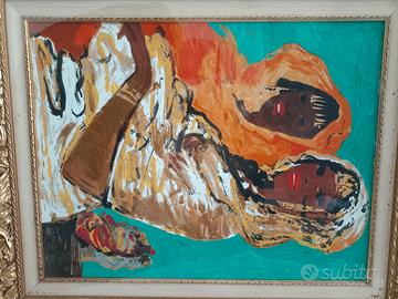 In vendita splendida opera del Maestro Salvatore Fiume (1915-1997) dal titolo "Le Hararine". Si tratta di una preziosa serigrafia polimaterica d'après realizzata su broccato, che riproduce fedelmente la matericità e la vivacità cromatica tipica delle opere africane dell'artista.