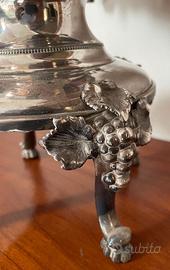 Splendido bollitore d'acqua vintage marchiato Reed & Barton. (importante produttore americano di argenteria). Risalente al 1952, grandi e profondi grappoli d'uva con foglie venate adornano l’oggetto, incluso il pomolo superiore. Appariscente e molto decorativo, perfetto come punto focale in sala da pranzo, cucina o su un vassoio da portata in argento. Design elegante per cui Reed & Barton è rinomato. Misura generosamente 43 cm di altezza x 26 cm di profondità.
