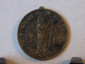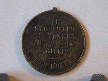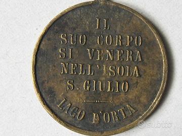 San Giulio prega per noi; Il suo corpo si venera nell’Isola di S. Giulio Lago d’Orta. Stupenda medaglia originale in bronzo, diametro mm 25,50 circa, appiccagnolo rimosso. Come da foto, buone condizioni, minimi segni d’uso.